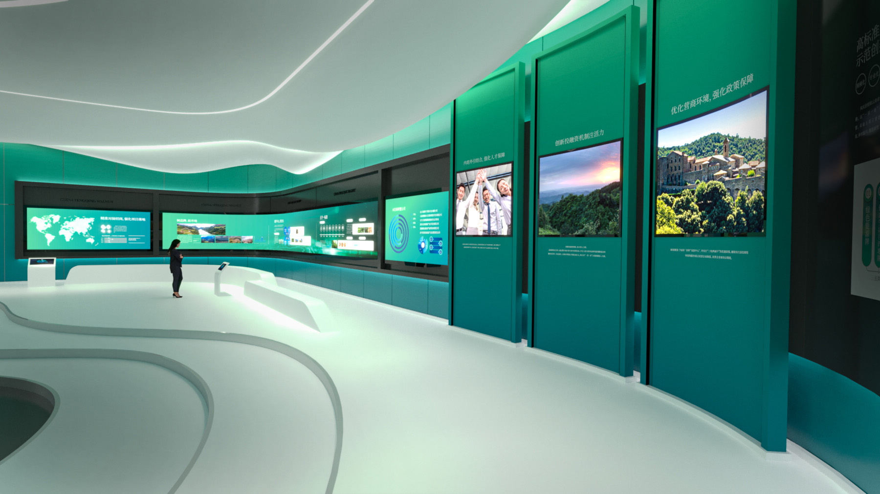 天度集團擁有專業(yè)的展廳展館主題策劃、內容制作、硬件集成、場館設計及施工團隊,以多媒體和數(shù)字化技術作為展示技術、最新的影視動畫技術,結合獨到的圖形數(shù)字和多媒體技術,實現(xiàn)人機交互方式的展廳形式,集各種多媒體展覽展示系統(tǒng)為一體的綜合展示平臺,包括數(shù)字沙盤、環(huán)幕/弧幕/球幕影廳、迎賓地幕系統(tǒng)、互動吧臺、虛擬漫游、LED拼接屏、互動鏡面及觸摸屏等實現(xiàn)數(shù)字化展廳一站式解決、實施方案。