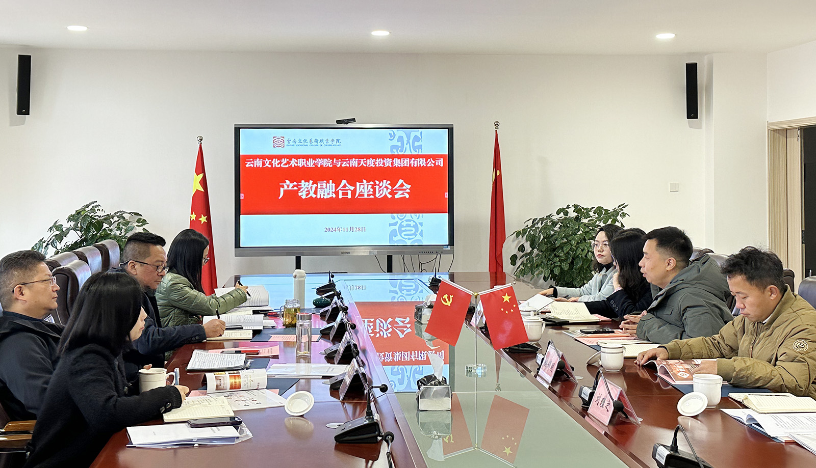 為深入貫徹省委、省政府關(guān)于推動產(chǎn)教融合的政策精神,加強(qiáng)學(xué)校與產(chǎn)業(yè)的深度融合發(fā)展,打造校企協(xié)同職業(yè)教育發(fā)展新模式,11月28日上午,云南文化藝術(shù)職業(yè)學(xué)院與云南天度投資集團(tuán)有限公司召開產(chǎn)教融合座談會。云南文化藝術(shù)職業(yè)學(xué)院黨委書記劉鑒允,黨委副書記、院長楊旭康,黨委委員、副院長孫鶴瑜,黨委委員、副院長劉悅;云南天度投資集團(tuán)有限公司董事長鄭桂文、副總經(jīng)理陳玉鳳、副總經(jīng)理施錦明,云南天度科技發(fā)展有限公司總經(jīng)理胡婷婷及相關(guān)負(fù)責(zé)人參加座談交流。