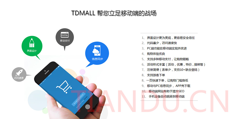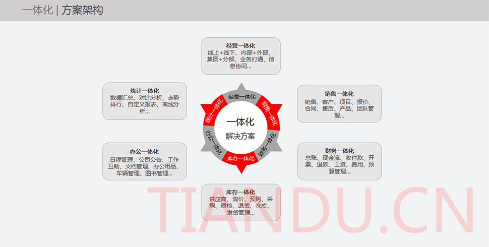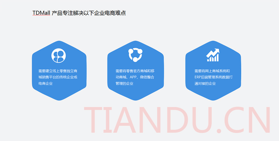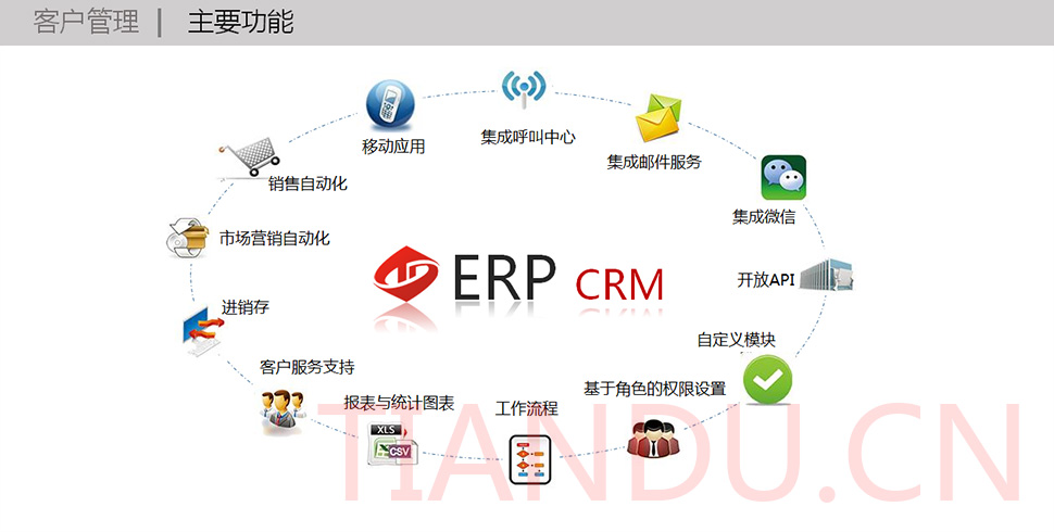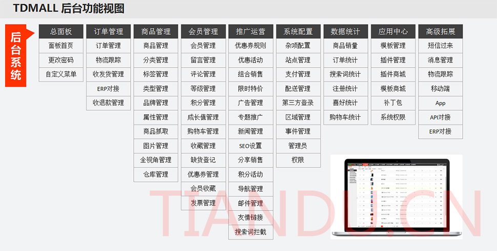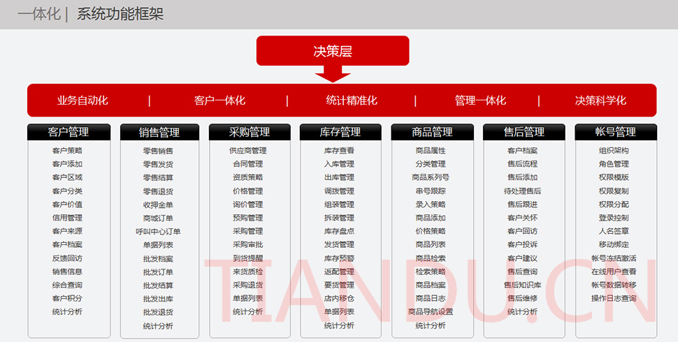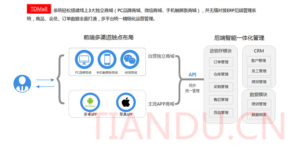 天度科技互聯(lián)研究院(博士后科研工作站)、天度軟件系統(tǒng)有限公司、天度科技股份有限公司合力近400人專業(yè)研發(fā)團隊,結(jié)合自身11年電子商務運營經(jīng)驗,全力打造TDMALL電商ERP系統(tǒng):整合電商網(wǎng)站平臺(PC版、觸屏版、微信版、APP版)、ERP企業(yè)資源管理系統(tǒng)、CRM客戶關(guān)系管理系統(tǒng)、財務管理系統(tǒng)、OA辦公系統(tǒng)和Call Center呼叫中心等系統(tǒng),實現(xiàn)前端電商平臺及后端強大支撐系統(tǒng)的管理。