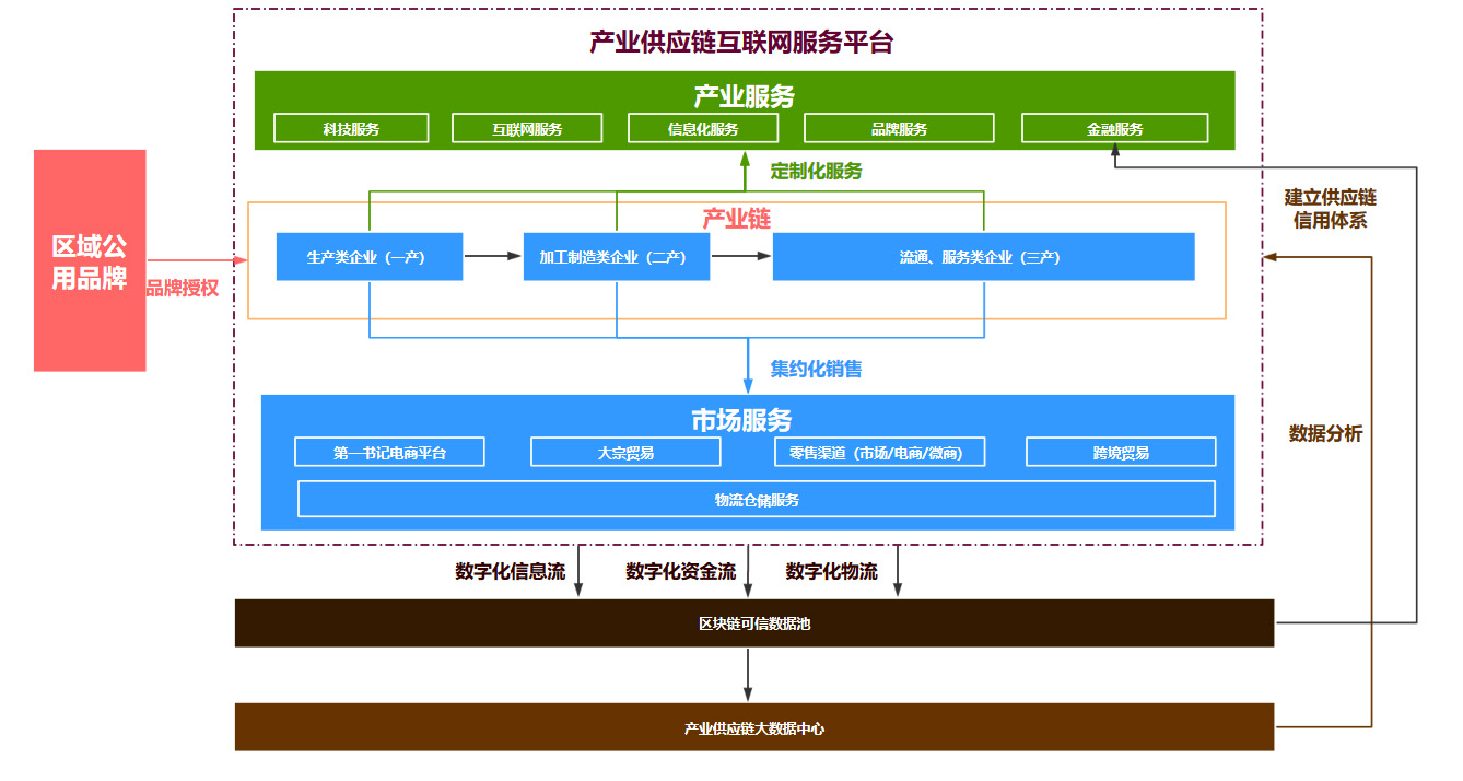 數(shù)字化供應(yīng)鏈服務(wù)平臺應(yīng)立足區(qū)域傳統(tǒng)產(chǎn)業(yè)、優(yōu)勢產(chǎn)業(yè)及重點(diǎn)支柱產(chǎn)業(yè),將電子商務(wù)將與發(fā)展需求充分結(jié)合,建立線上線下一體化的服務(wù)體系。平臺將區(qū)域品牌化體系建設(shè)為產(chǎn)業(yè)標(biāo)準(zhǔn)入口,服務(wù)于供應(yīng)鏈內(nèi)各企業(yè)主體,貫穿產(chǎn)業(yè)鏈從生產(chǎn)端、加工制造端、流通端全鏈條,以提升供應(yīng)鏈各主體協(xié)同效率。同時,平臺以數(shù)字化為核心手段及時獲取供應(yīng)鏈信息流、物流、資金流等數(shù)據(jù),并基于區(qū)塊鏈技術(shù)建立一套產(chǎn)業(yè)可信數(shù)據(jù)池,應(yīng)用大數(shù)據(jù)分析技術(shù)對供應(yīng)鏈進(jìn)行動態(tài)分析,最終實現(xiàn)智慧化供應(yīng)鏈系統(tǒng),成為基于數(shù)字化供應(yīng)鏈的集約化、智能化、創(chuàng)新性的開放式產(chǎn)業(yè)生態(tài)平臺,以市場化、數(shù)據(jù)化、智慧化的運(yùn)營方式促進(jìn)產(chǎn)業(yè)升級,創(chuàng)造價值與財富。
