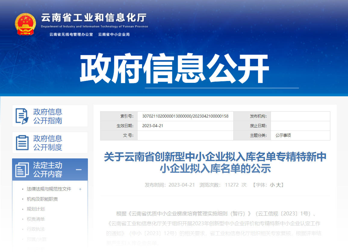 根據(jù)《云南省優(yōu)質(zhì)中小企業(yè)梯度培育管理實(shí)施細(xì)則(暫行)》(云工信規(guī)〔2023〕1號(hào))、《云南省工業(yè)和信息化廳關(guān)于組織開展2023年創(chuàng)新型中小企業(yè)評(píng)價(jià)和專精特新中小企業(yè)認(rèn)定工作的通知》(中小〔2023〕12號(hào))的相關(guān)要求,經(jīng)省工業(yè)和信息化廳組織相關(guān)專家復(fù)核,天度集團(tuán)旗下云南天度軟件系統(tǒng)有限公司入選2023年云南省專精特新中小企業(yè)、云南省創(chuàng)新型中小企業(yè)名單;云南蔚嵐信息技術(shù)有限公司入選2023年云南省創(chuàng)新型中小企業(yè)名單。