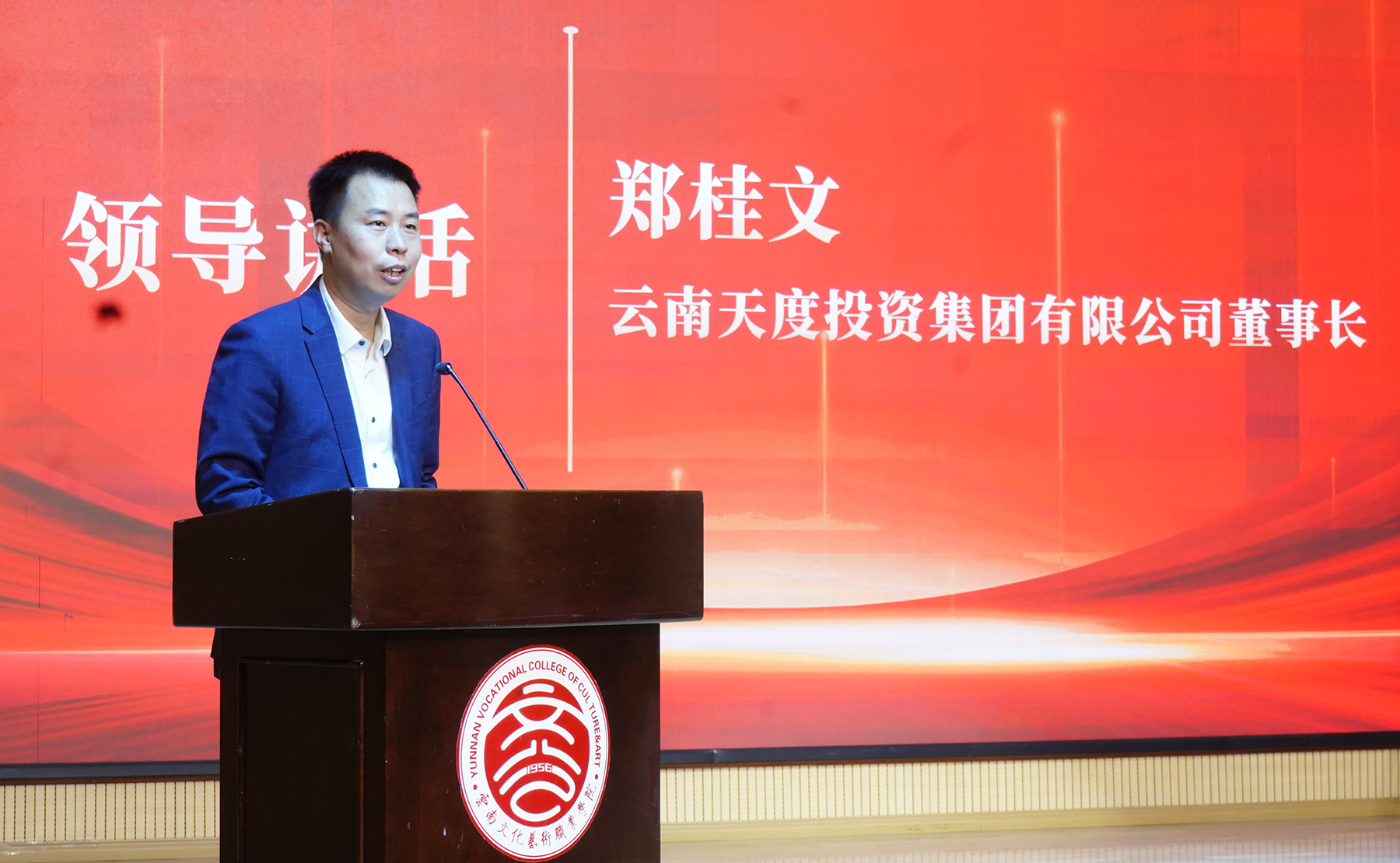 鄭桂文董事長(zhǎng)在致辭中表示,此次合作是校企雙方貫徹落實(shí)國(guó)家職業(yè)教育改革政策、深化產(chǎn)教融合的重要舉措,也是天度集團(tuán)踐行“以產(chǎn)業(yè)反哺教育、以教育賦能未來(lái)”使命的重要一步。天度集團(tuán)將發(fā)揮其作為區(qū)域數(shù)字經(jīng)濟(jì)龍頭企業(yè)所擁有大數(shù)據(jù)研究院、博士后科研工作站等技術(shù)資源優(yōu)勢(shì),以及深耕數(shù)字經(jīng)濟(jì)20年的產(chǎn)業(yè)優(yōu)勢(shì),與學(xué)校共同聚焦融媒體技術(shù)與運(yùn)營(yíng)、人工智能技術(shù)應(yīng)用、軟件技術(shù)、信息安全應(yīng)用技術(shù)等相關(guān)專業(yè),通過(guò)“共建共管”模式深化產(chǎn)教融合,圍繞數(shù)字經(jīng)濟(jì)、文旅融合等重點(diǎn)產(chǎn)業(yè)發(fā)展需求,共同建設(shè)校內(nèi)外實(shí)訓(xùn)基地,克隆企業(yè)真實(shí)研發(fā)環(huán)境,構(gòu)建專業(yè)集群交叉矩陣,共同制定專業(yè)發(fā)展規(guī)劃,定期評(píng)估產(chǎn)業(yè)趨勢(shì),動(dòng)態(tài)優(yōu)化課程體系,保持教學(xué)內(nèi)容與產(chǎn)業(yè)發(fā)展同步,實(shí)現(xiàn)“產(chǎn)業(yè)需求進(jìn)大綱、技術(shù)標(biāo)準(zhǔn)進(jìn)課堂、真實(shí)項(xiàng)目進(jìn)實(shí)訓(xùn)”,合力打造精準(zhǔn)適配市場(chǎng)需求的特色專業(yè)集群,培養(yǎng)數(shù)字經(jīng)濟(jì)領(lǐng)域高素質(zhì)技術(shù)技能型人才,賦能區(qū)域數(shù)字經(jīng)濟(jì)、文旅融合等重點(diǎn)產(chǎn)業(yè)發(fā)展。鄭董事長(zhǎng)還強(qiáng)調(diào)指出,希望通過(guò)此次合作,雙方將進(jìn)一步推動(dòng)成立產(chǎn)業(yè)學(xué)院并使其成為云南文化藝術(shù)產(chǎn)業(yè)數(shù)字化的“創(chuàng)新引擎”,讓每一位學(xué)子在這里找到“用技術(shù)守護(hù)文化、用創(chuàng)意點(diǎn)亮人生”的舞臺(tái)!共同書(shū)寫(xiě)產(chǎn)教融合的新篇章,為云南乃至全國(guó)的數(shù)字經(jīng)濟(jì)及文旅融合產(chǎn)業(yè)注入新的活力與動(dòng)能!