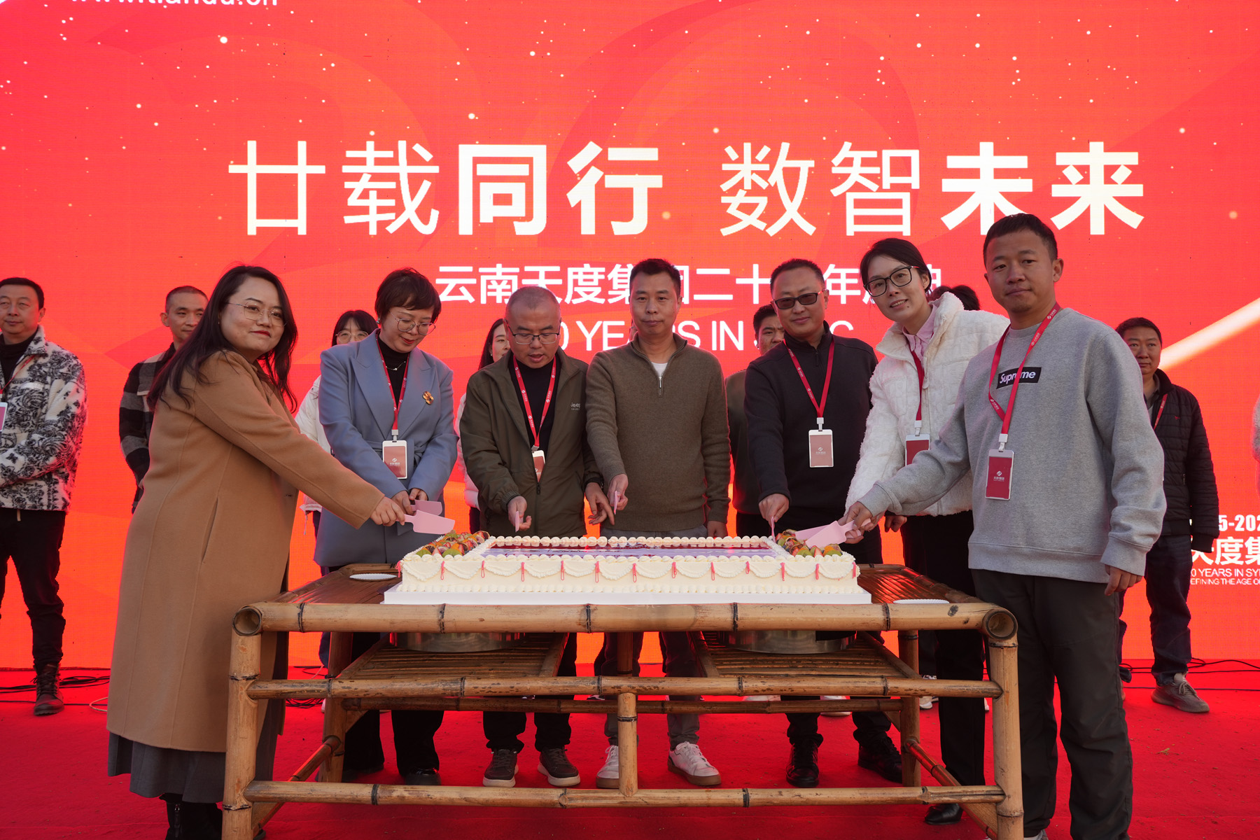 隨后,鄭桂文董事長率集團(tuán)高管團(tuán)隊共同切開精心設(shè)計的二十周年巨型慶典蛋糕。甜蜜的喜悅,由所有天度人共同分享,將現(xiàn)場氣氛推向首個高潮。